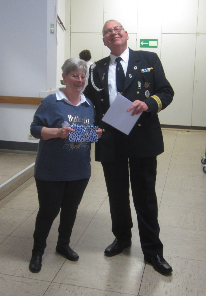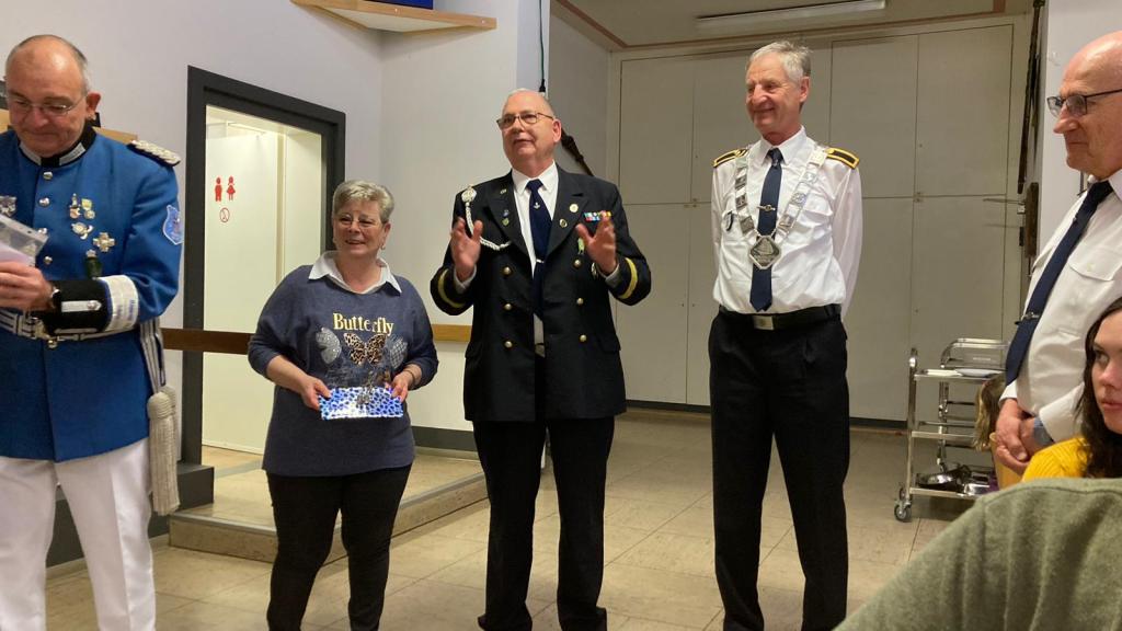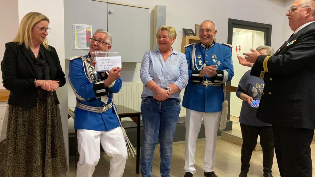 Unsere amtierende Majestät 2024, Nino Faranda, war natürlich dabei und gratulierte dem Zugkönig zu seiner Regentschaft. Er überreichte auch dem Kommandanten ein Geschenk als Erinnerung an diesen Tag.