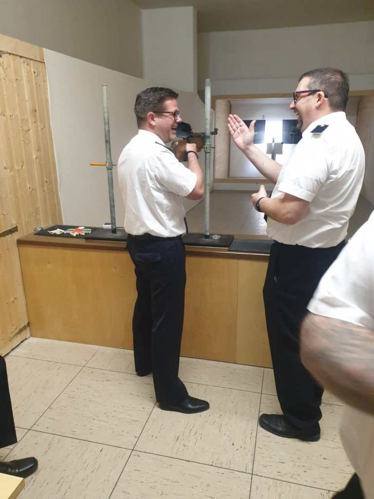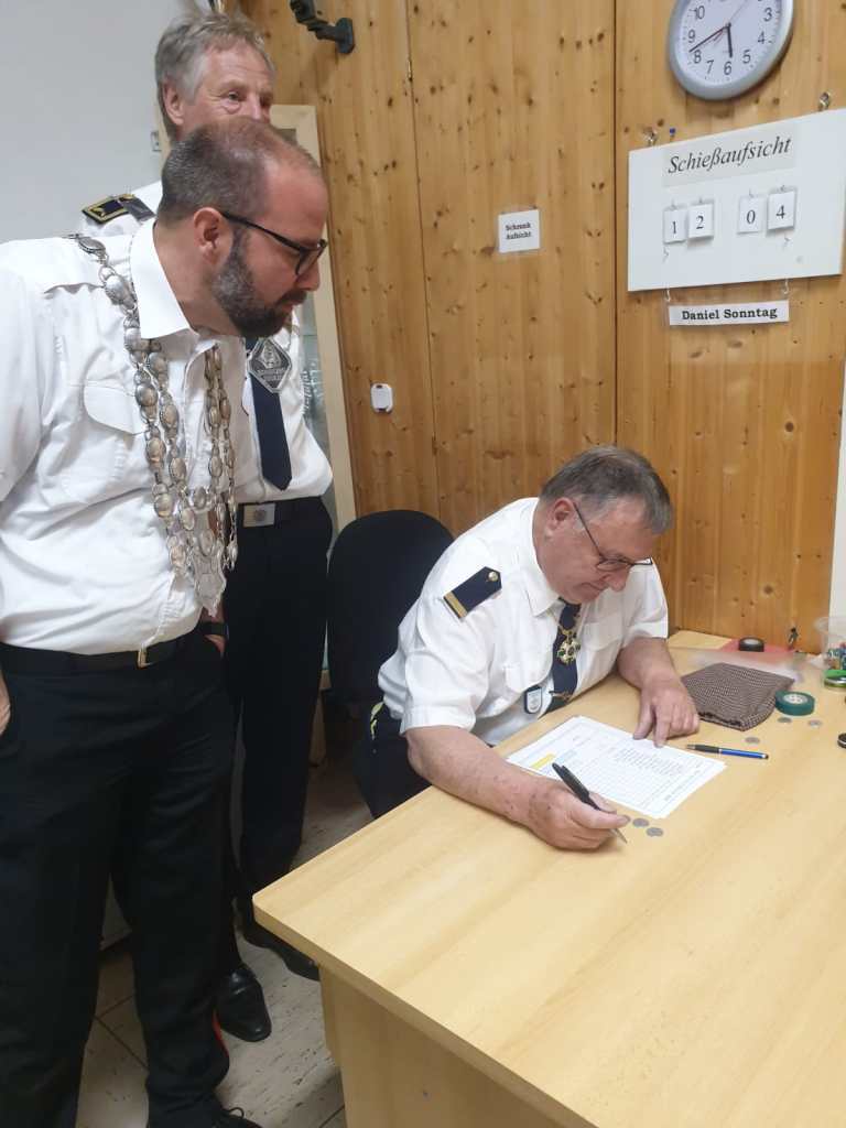 Günter Lindemann, der im vergangenen Jahr seinen 70. Geburtstag gefeiert hatte, übernahm die Kosten des diesjährigen ZK-Schießens. Der Tradition folgend, hatten die Kameraden ein persönliches Lied gedichtet, das mit kräftigen Stimmen und viel Herzblut vorgetragen wurde. Im Anschluss überreichte der Kommandant den gerahmten Liedtext, begleitet von einem Geschenk der Mitglieder.