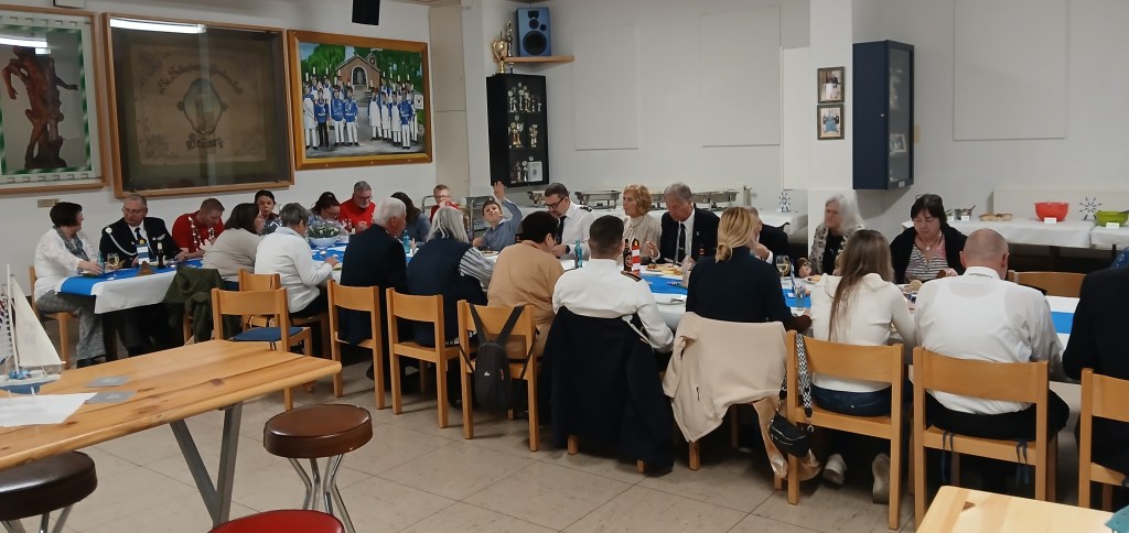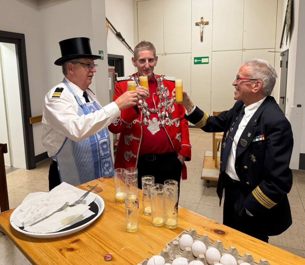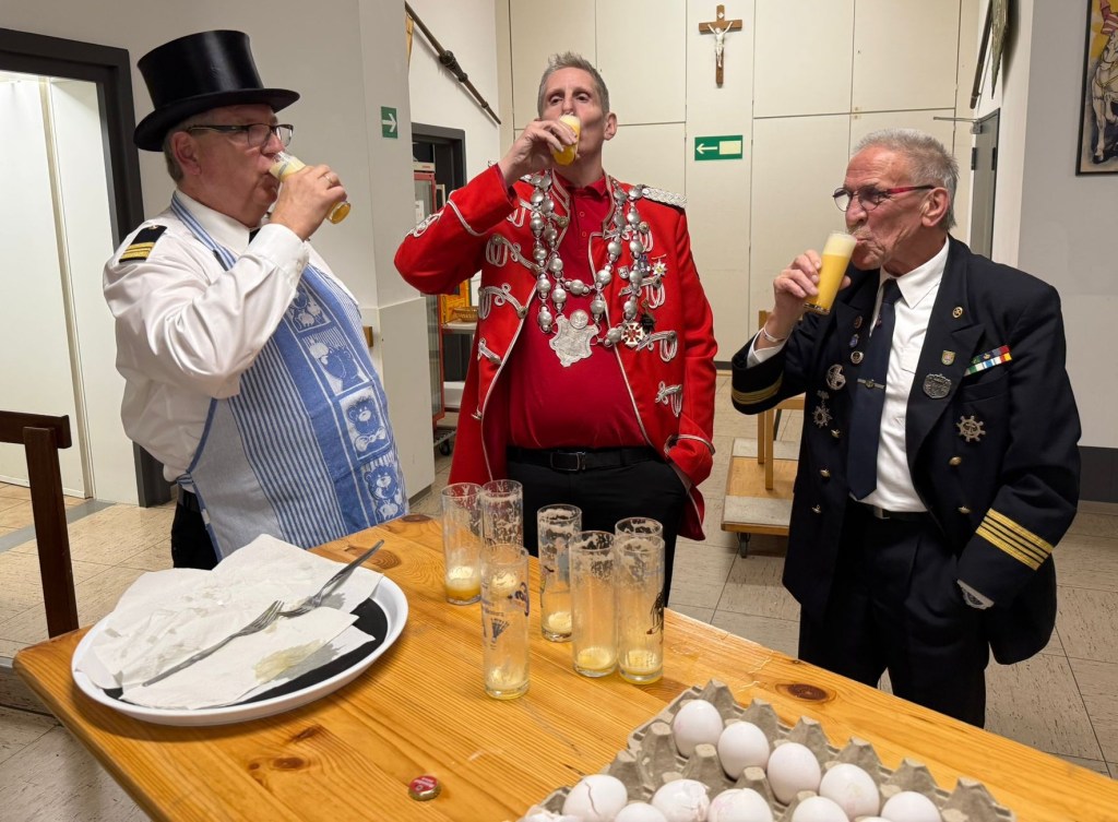 Zur Tradition gehört es beim Marinezug, das Eierbier. Hier war unser Schützenkönig Benjamin Rausch ein Vorbild, nicht nur sein Eierbier, sondern auch das seines Adjutanten (der wollte absolut nicht) hat er getrunken. Auch ein drittes trank er mit unserem Kommandanten.